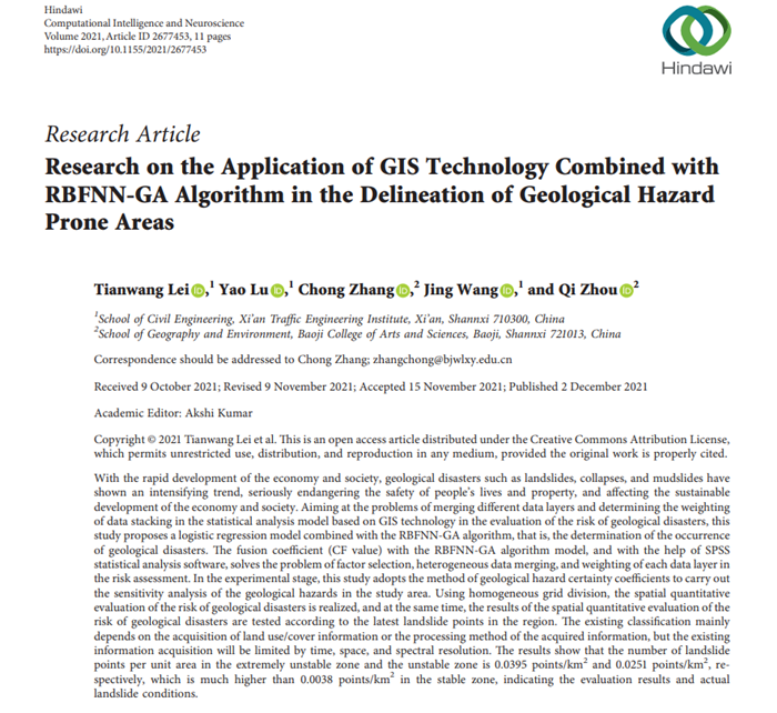 近日,土木工程学院教师雷田旺关于灾害风险评估的最新研究成果(论文题目为:Research on the Application of GIS Technology Combined with RBFNN-GA Algorithm in the Delineation of Geological Hazard Prone Areas.)被国际学术期刊《Computational Intelligence and Neuroscience》(SCI一区,影响因子IF:3.633 )录用。雷田旺老师为第一作者,必威电竞竟猜 为第一单位。