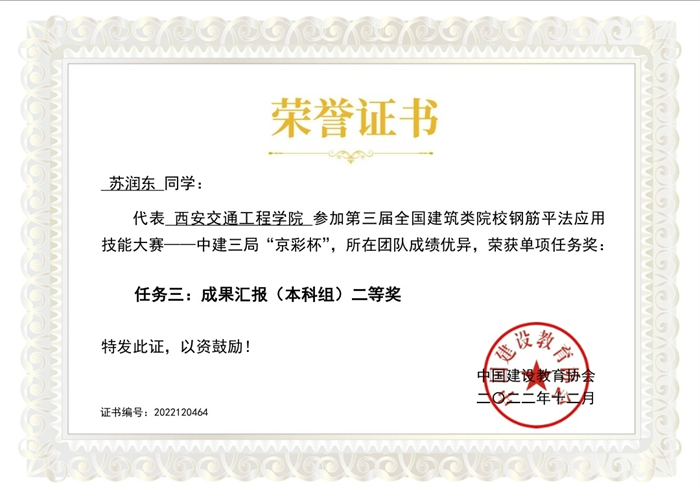 2022年12月,中国建设教育协会成功举办了第三届全国建筑类院校钢筋平法应用技能大赛—中建三局“京彩杯”全国总决赛,土木工程学院教师曹会敏、刘龙刚指导,罗煜杰、苏润东、姜萌3名学生组成的“西交院梦三队”荣获全国总决赛本科组二等奖。