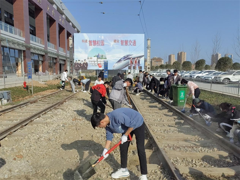 活动现场,学院专业教师带头示范,同学们分工协作、密切配合,有的同学拔除道床上的杂草、整理线路外观,有的同学对道砟进行清理、转运、重新摊铺,有的同学对铁路道口轨道缝隙中的积土进行清理,有的同学对轨枕上的扣件进行检查拧紧……现场一片热火朝天的劳动景象。经过师生们的共同努力,实训基地里的轨道线路面貌焕然一新。