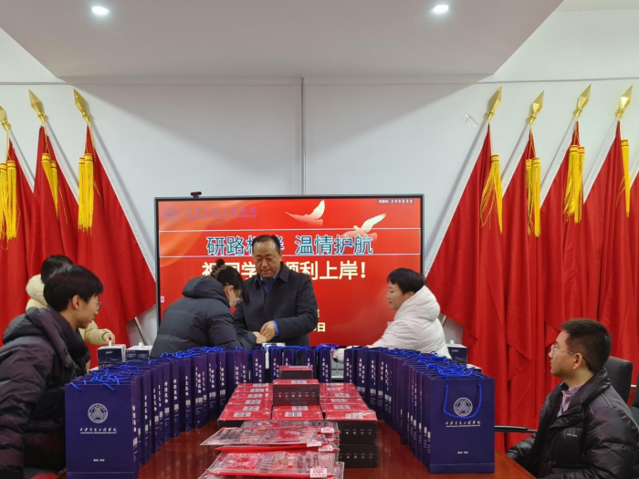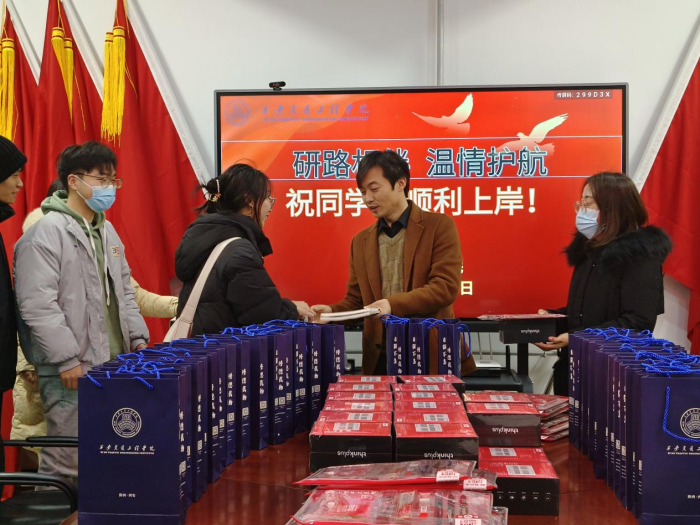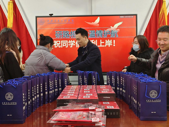 最后,副校长王勇及各位领导、老师为考研学子送上学院精心准备的“考试加油包”。“考试加油包”寄托着学院对考研学子的期许,饱含着美好祝愿:文具福袋寓意妙笔生花,一战成“硕”;特仑苏牛奶寓意一路“金牌”,一切如愿;暖手宝代表学院及领导、老师“温情护航”,为考研学子做好服务保障!祝福鼓励的话语、精致暖心的礼包为考研学子注入了考试信心,同学们纷纷表示:一定会全力以赴,以饱满的精神状态迎接即将到来的考试,回报学校的悉心培养和亲切关怀。
