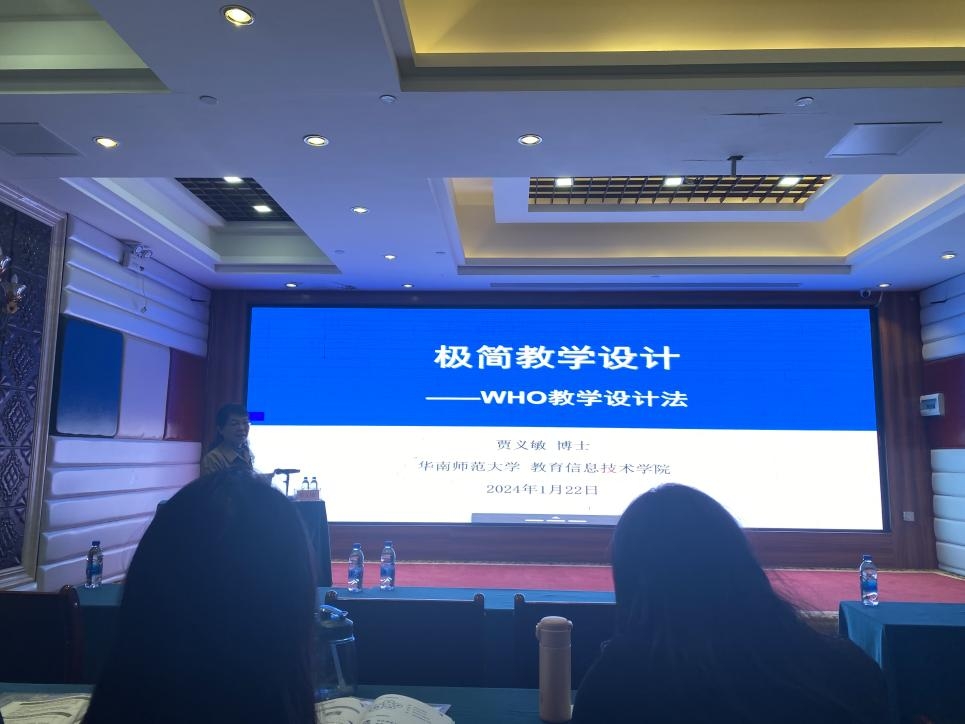 培训期间,华南师范大学贾义敏老师以“极简教学设计——WHO教学设计法”为主题,从“何为教学设计”、“WHO教学设计法与案例分析”、“教师教学设计注意问题”三个方面进行了分享与介绍,指出合理的教学设计有利于教学理论与教学实践结合,为实施教学活动提供最佳方案和措施,实现教学工作的科学化,同时,有利于促进教师科学思维习惯和能力的发展,提高发现问题、解决问题的能力。贾义敏老师通过对教什么、怎么教和怎么评等内容的介绍,提出了了众多教学策略、教学方法和教学手段。期间,我校参会教师与其他学校参会人员针对教学设计ADDIE模型、目标首要原理、如何突破教学重难点、交互技术的有效利用以及学习评价的多元化等内容进行了交流与探讨。