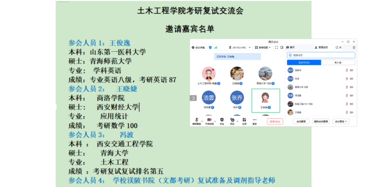 为帮助考研学生做好复试、调剂准备工作,缓解学生备考压力,提高复试及调剂成功率,3月14日晚上,土木工程学院召开考研复试与调剂指导交流会,本次交流会采取线上会议模式,邀请到优秀校友青海大学研究生冯波学长、青海师范大学研究生王俊逸同学、西安财经大学研究生王晓婕同学以及学校渼陂书院的段雪妮老师。2020级考研学生、其他年级考研意向生三十余名学生参加了会议。会议由毕业班年级组组长陶鑫老师主持。
