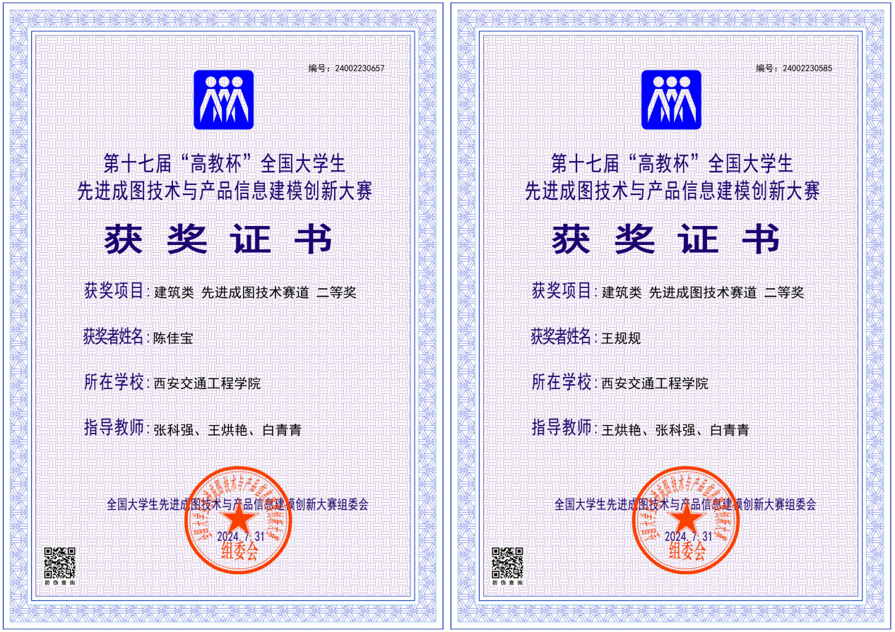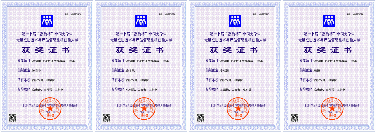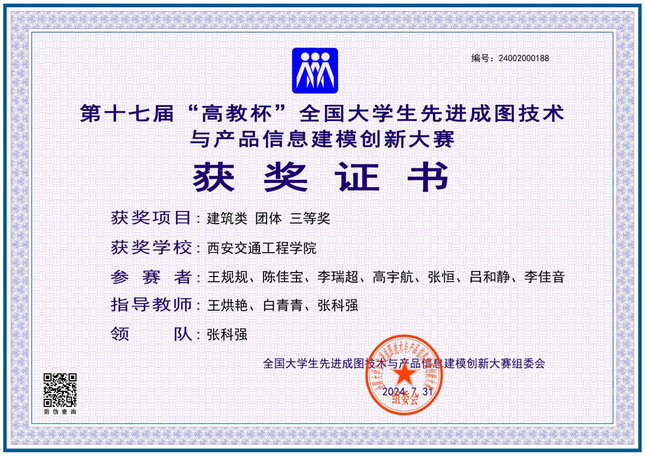 本次大赛涵盖了机械类、建筑类、道桥类和水利类四个类别,主要围绕工程图表达、制图基础知识、产品信息建模、轻量化设计、增材制造、数字化创新设计、BIM综合应用等项目进行综合命题竞赛。根据赛事安排,土木与铁道工程学院从2024年1月开始筹备,历时6个月。通过校赛、省赛的选拔,最终由张科强、王烘艳和白青青三位教师指导的10名学生代表学校参加全国总决赛。土木与铁道工程学院由张科强、王烘艳和白青青三位教师指导的10名学生代表学校参加全国总决赛。经过激烈角逐,王规规、陈佳宝2名同学分别获得建筑类先进成图技术赛道二等奖,高宇航、李瑞超、张恒、陈泽坤4名同学分别获得建筑类先进成图技术赛道三等奖;王规规、陈佳宝、李瑞超、高宇航、张恒、陈泽坤、吕和静、李佳音7名同学获得全国总决赛建筑类团体三等奖;张科强、王烘艳、白青青三位教师分别获优秀指导教师三等奖。