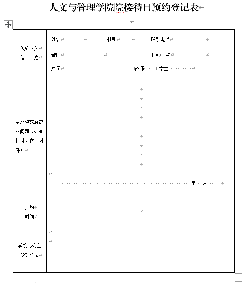 为有针对性地安排接待访谈,提高接访事项办理效率,建议来访人员提前预约登记。拟参加接待日的师生员工请在微信公众平台下载、填写《人文与管理学院院接待日预约登记表》(见附件),提前3个工作日连同相关书面材料交至学院办公室登记预约。