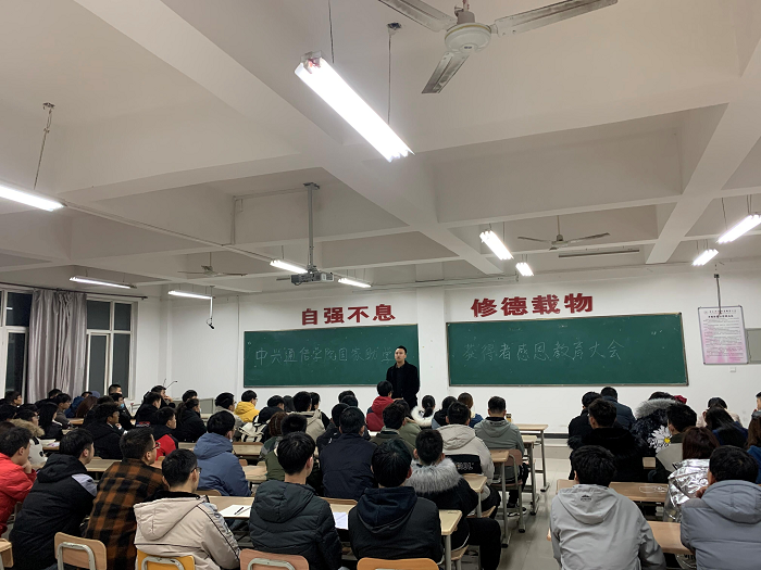 ---感恩教育活动。为他人树立榜样,培养学生感恩精神。12月9日晚该院于 A514举行“2020年国家奖助学金获得者感恩教育大会”。会议要求同学们应提高自主学习能力,重视专业课的学习。资助政策不仅能为家庭经济困难学生带来憧憬和希望,也激发了面对未来的勇气,我们更要知恩感恩、奋发图强、励志成才,将这份感恩不断传递下去,脚踏实地用自己的实际行动来回报社会!