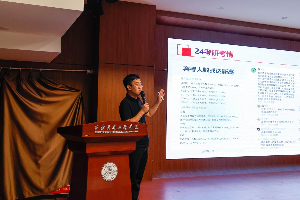 贺波老师通过讲座和互动的方式,对考研院校和专业的选择、复习备考的经验等议题进行了深入的阐释。首先,他向学生介绍了如何全面了解目标院校的具体要求,包括招生简章、录取分数线、报录比、师资力量、科研平台、就业状况等关键信息。同时,他建议学生关注院校官方网站、考研论坛以及学长学姐的经验分享,以确保在选择时不盲目跟从,做到心中有数。接着,贺老师强调了结合个人实际情况进行理性分析的重要性。他指出,学生应考虑院校的地理位置、学术氛围、资源条件是否与个人发展目标相契合,以及专业的研究方向、课程设置、发展前景是否符合个人职业规划。同时,他提醒学生,择校择专并非一成不变,随着备考进程的深入,个人情况也可能发生变化。