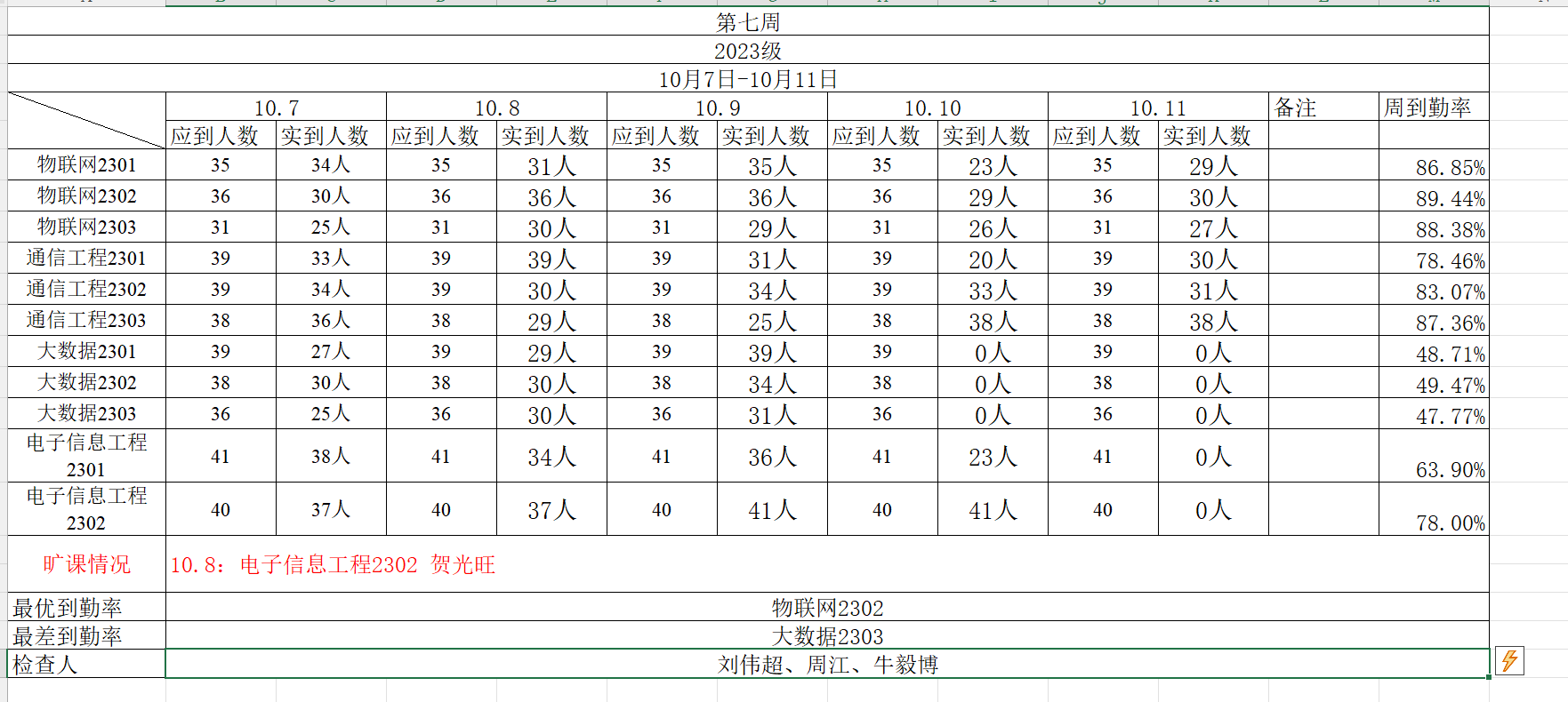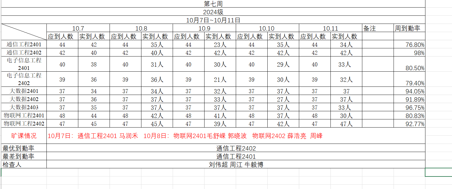 现将中兴通信学院第七周各班晚自习检查名单公布如下: