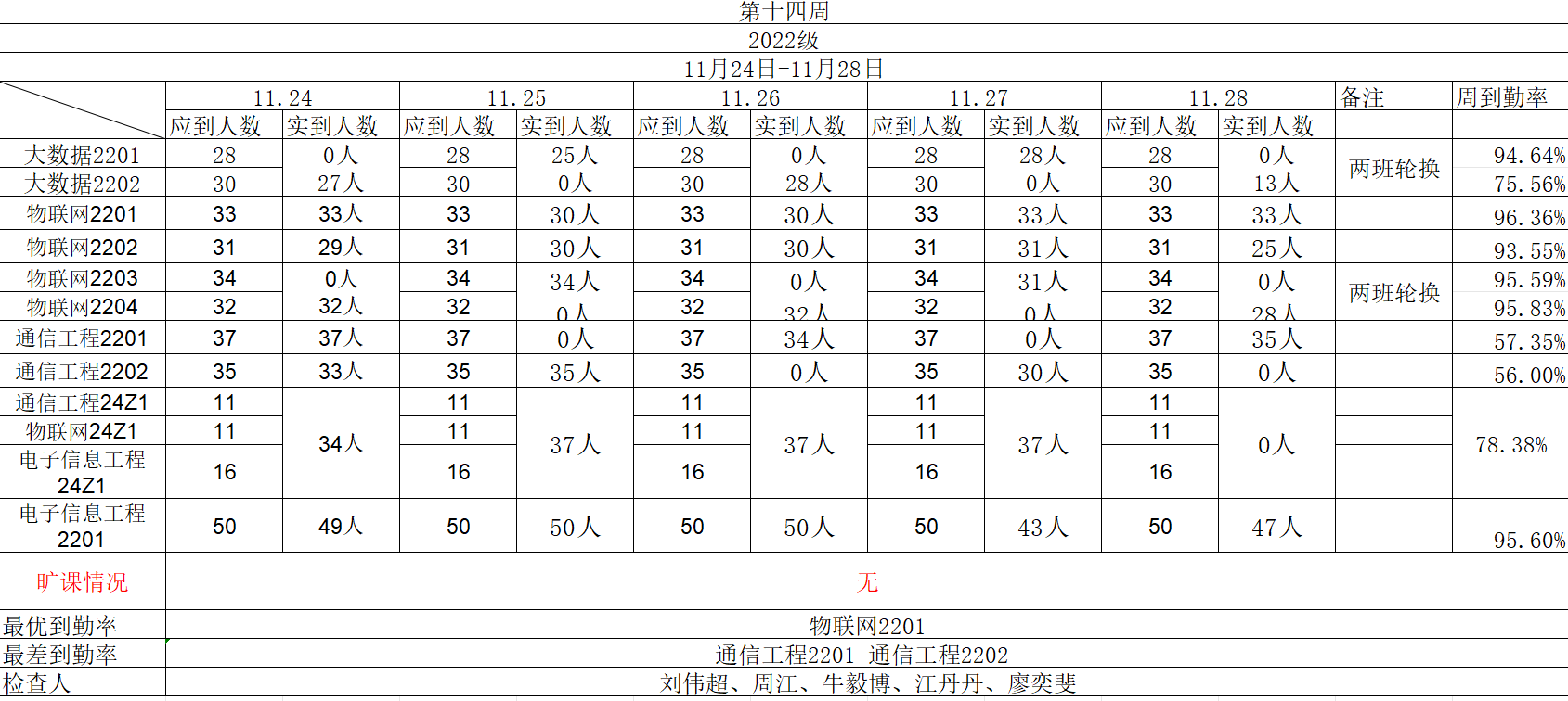 现将中兴通信学院第十四周各班晚自习检查名单公布如下: