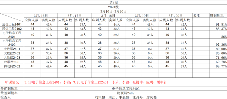现将中兴通信学院第四周各班晚自习检查名单公布如下: