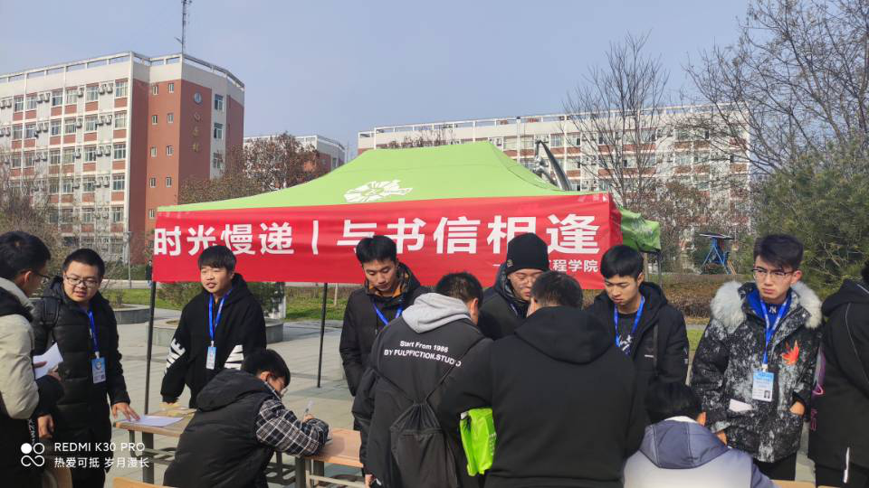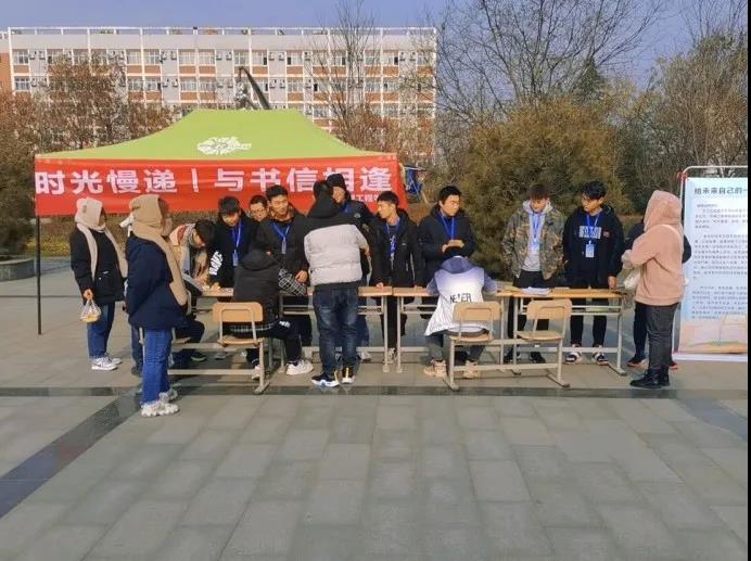 本次活动由机械工程学院团总支学生会组织部主办,以“时光慢递,给未来的一封信”为主题,于2020年12月8日在学校西广场举行。同学们通过现场书写书信,装入信封,一年后由组织部负责整理寄出。借助寄向未来的信件,记录时光在我们身上留下的印迹和我们在时光中悄无声息的成长。