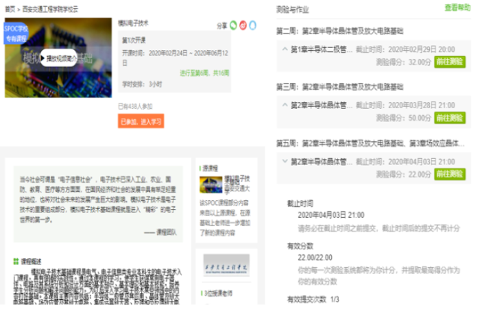 在2月初,学校教务处就已经和学堂在线、智慧树、超星尔雅、中国大学MOOC取得联系,给我校搭建校级在线开放课程管理平台,积极给老师们提供各种网络教学培训。通过学习,结合本课程的特点,在反复讨论和深入研究的基础上,我们选择了依托中国大学MOOC平台,以异步SPOC方式引进西安交通大学的国家精品课《模拟电子技术基础》的MOOC资源,按照我院课程教学大纲要求,对资源进行二次加工,添加课后作业和章节测试,供我院学生线上学习、练习和检测。在学习过程中,通过结合QQ发布各种教学活动和教学任务,督促学生按时完成。视频的内容可以回看,方便复习。