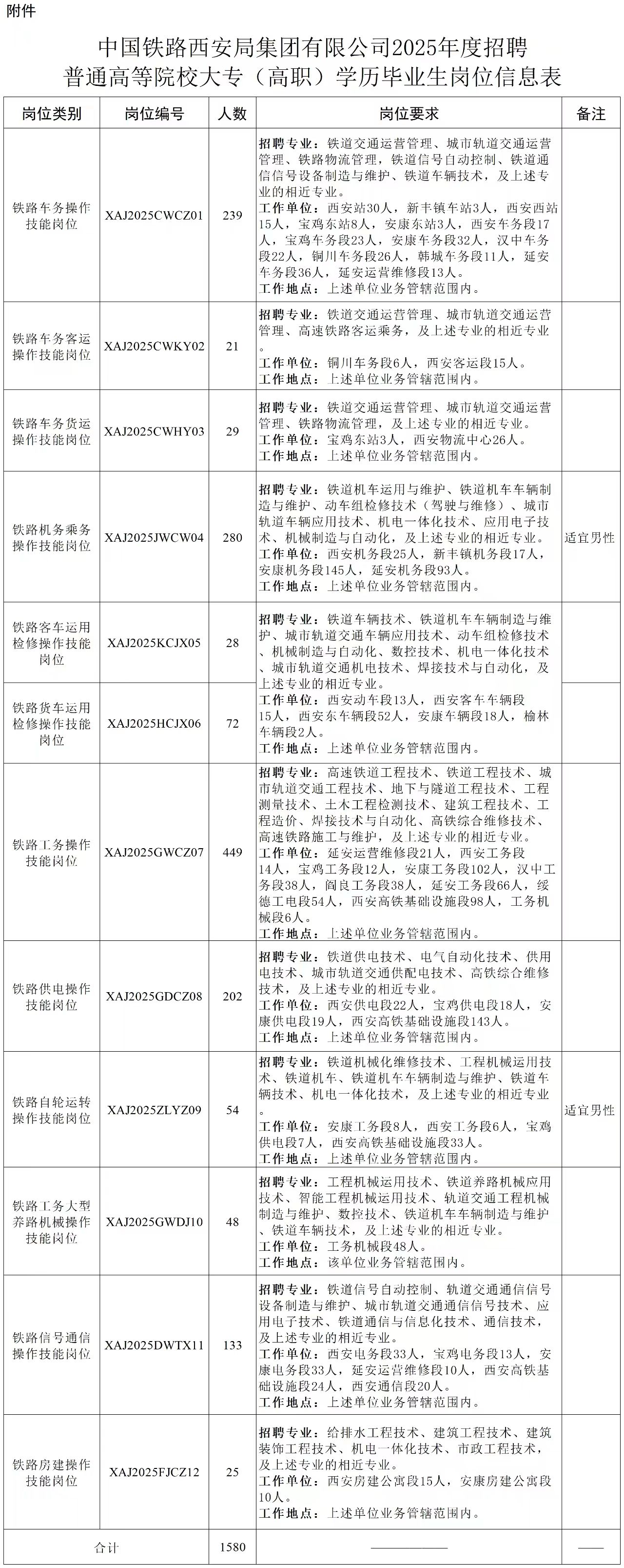 本次计划招聘1580人招聘岗位均为铁路运输生产一线操作技能岗位招聘岗位、专业、工作地点及人数等内容见下表↓↓↓