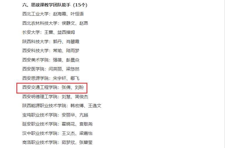 根据《关于持续深化陕西学校思政课教师“大练兵”主题活动的通知》和 《关于举办2022年度陕西高校思政课教师“大练兵”省级现场展示活动的通知》\安排,经高校推荐、网络初评、现场展示、专家评审等环节,我校马克思主义学院思政课教学团队张倩、刘盼喜获2022年度陕西高校思政课教师“大练兵”思政课教学团队能手荣誉称号。