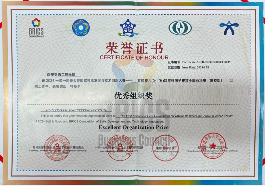 在“2024一带一路暨金砖国家技能发展与技术大赛—首届婴儿(0-1岁)回应性照护赛项全国总决赛”中我校荣获(高校组)优秀组织奖。我校人文与管理学院承办了该项赛事的西北区域赛。