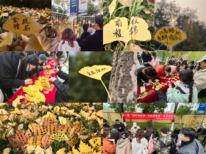 前来的师生们排起长队,从银杏叶铺成的金色“地毯”上拾起自己心仪的一片,交由“执笔人”题写。提笔挥毫间,“未来可期”“成功上岸”“愿与光同行”等美好的祝福、寄语,经墨香晕染,被题写于片片黄叶。