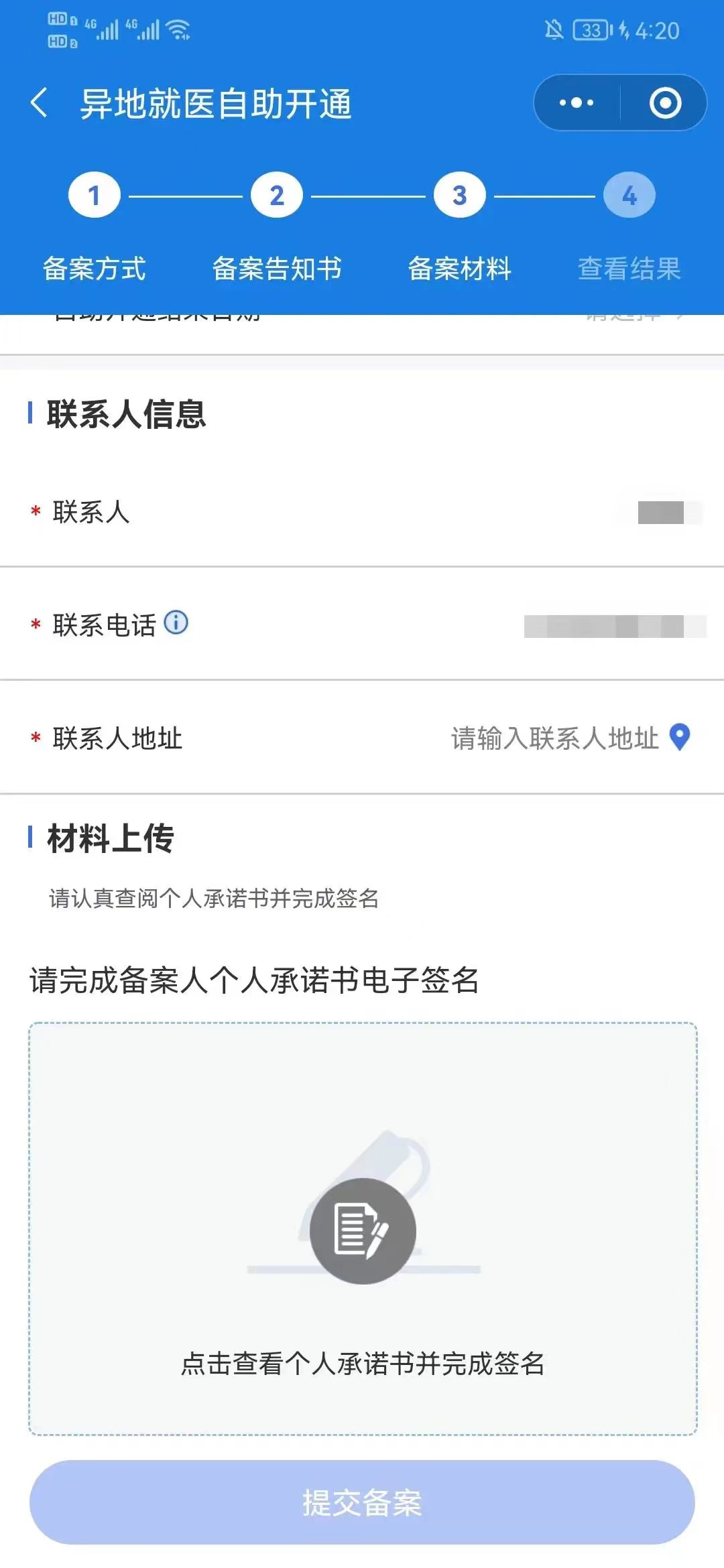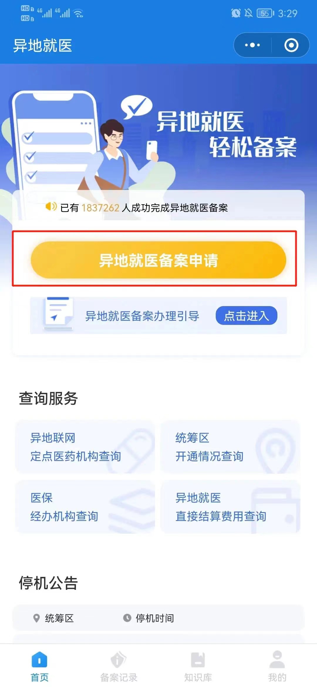 微信搜索“国家异地就医备案”小程序,点击“异地就医备案申请”,仔细阅读告知书点击“我已阅读,开始备案”,填写信息,提交材料后,点击“提交备案”。(注: 小程序只能为本人办理)。