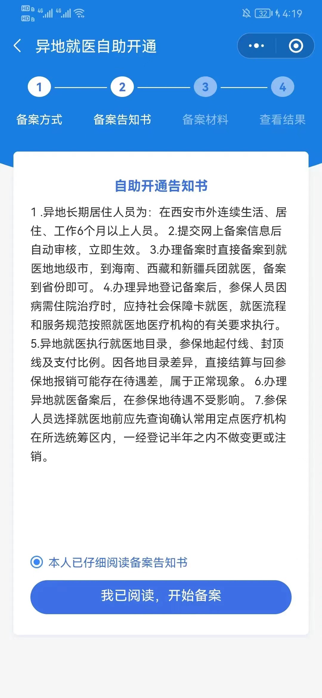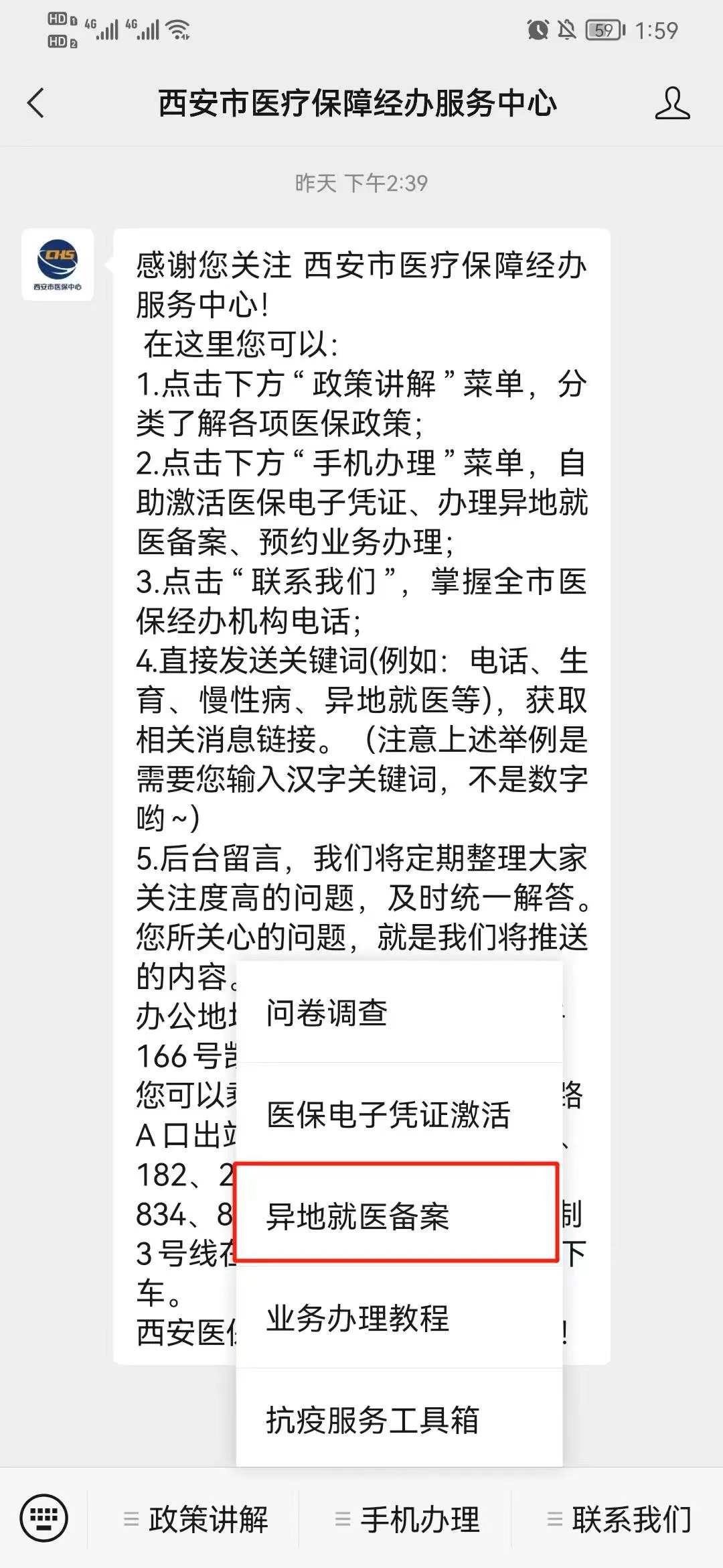 关注“西安市医疗保障经办服务中心”微信公众号——点击“手机办理”——点击“异地就医备案”即可进行跨省自助备案。