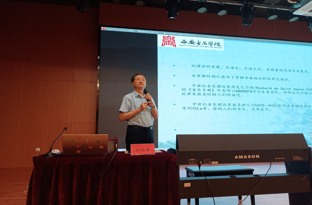 为提高音乐学专业学生对视唱练耳专业的学习与深入了解,6月12日,人文与管理学院音乐学专业邀请到西安音乐学院教授、硕士研究生导师刘荣弟教授,在实验楼学术报告厅举办了题为——“管窥欧洲乐谱历史 - 意大利朗读乐谱教学研究”的讲座。